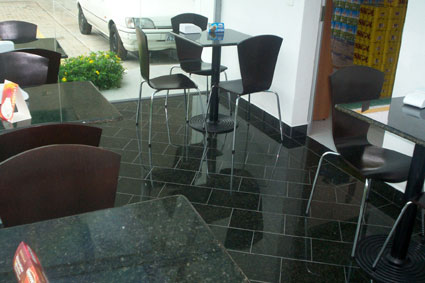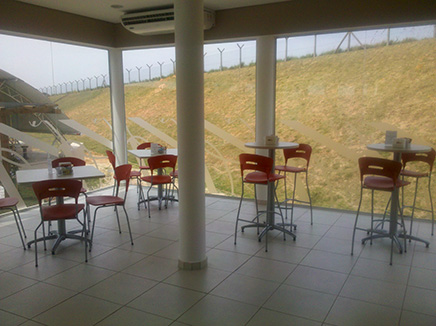 Mesas de granito fixas com cadeiras giratórias