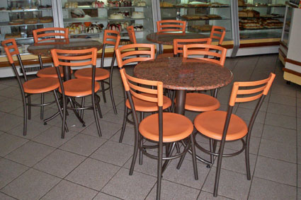 Cadeiras com assento estofado e mesas para confeitarias