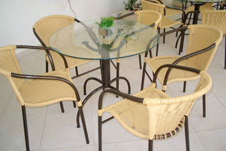 Mesas e cadeiras com ratan para confeitarias