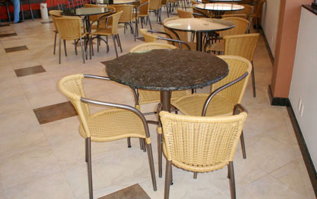 Mesas em granito e cadeiras com assento estofado para restaurantes