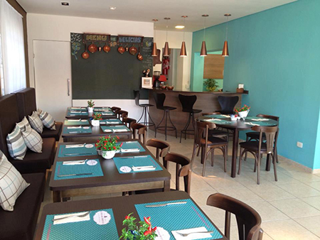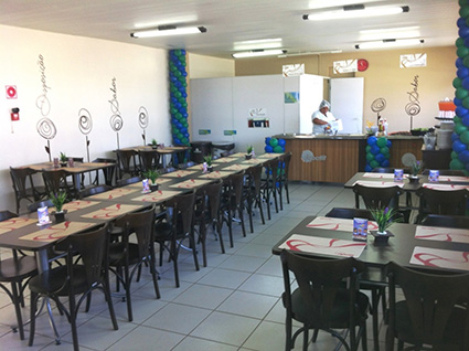 Mesas em MDF e cadeiras estofadas para confeitarias